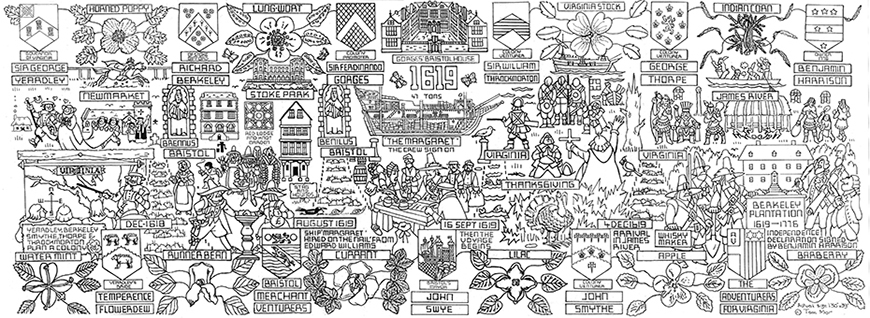 The new tapestry and educational book is Tom Mor's 'history without tears' approach in recording that momentous voyage, made possible by today's Adventurers for Virginia who are patrons of the project and determined to make the importance of Anglo-American early history better known. Two scenes in the Tapestry are reserved for American stichers.